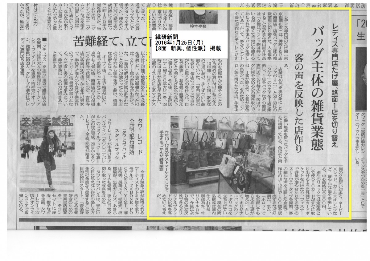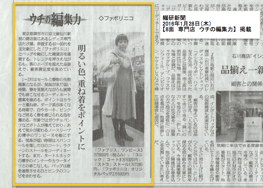 2016年1月28日(木)の繊研新聞 8面 【専門店 ウチの編集力】に