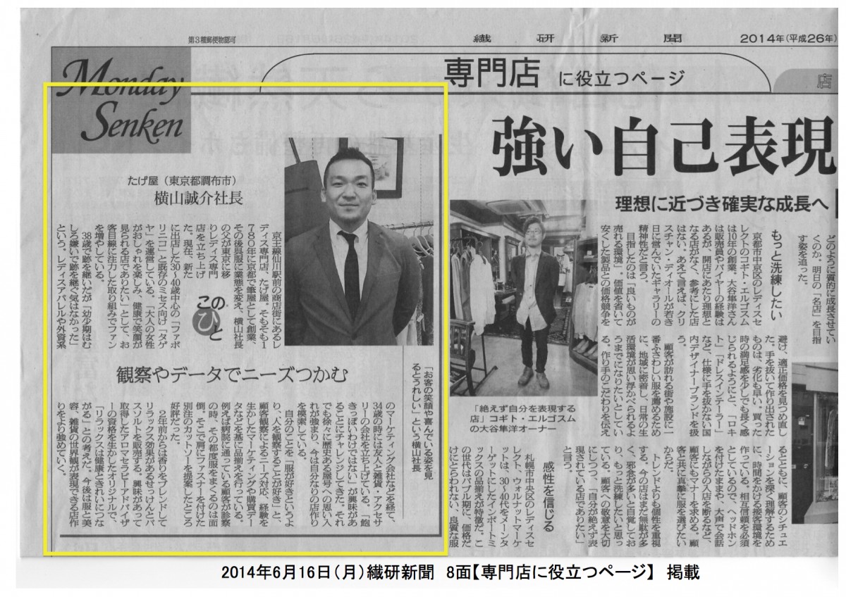2014/8/18 繊研新聞 7面【専門店に役立つページ】に、